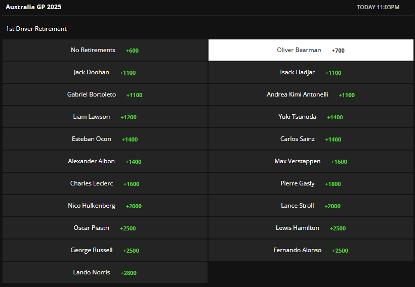 The last bet I have placed I feel a little bad about. It is the 1st Driver Retirement to be Ollie Bearman at +700.