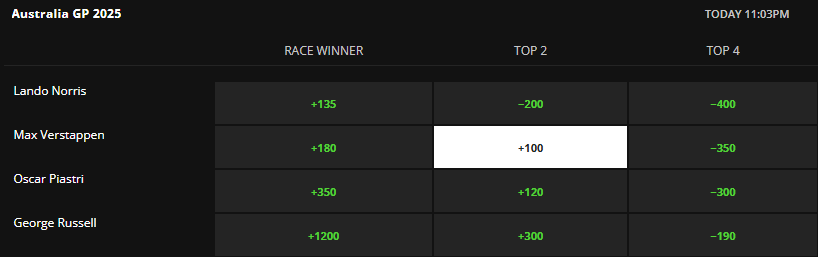 One thing to keep in mind for this race is the weather. With the threat of rain for the race a lot of chaos can happen. One bet I really like is Max Verstappen Top 2 Finish at +100.