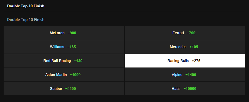 Another bet that I like is Double Top 10 Finish for Racing Bulls at +275.